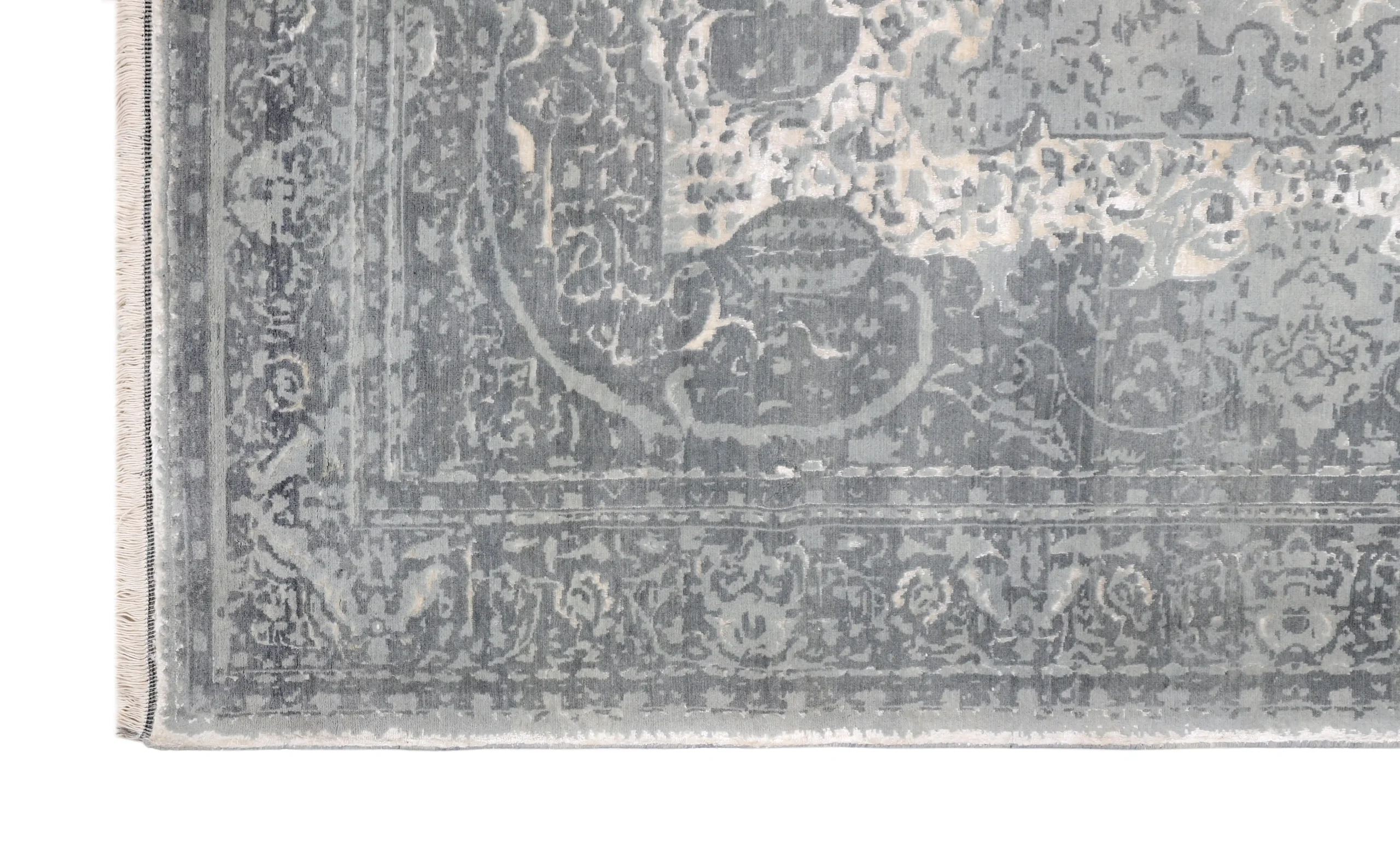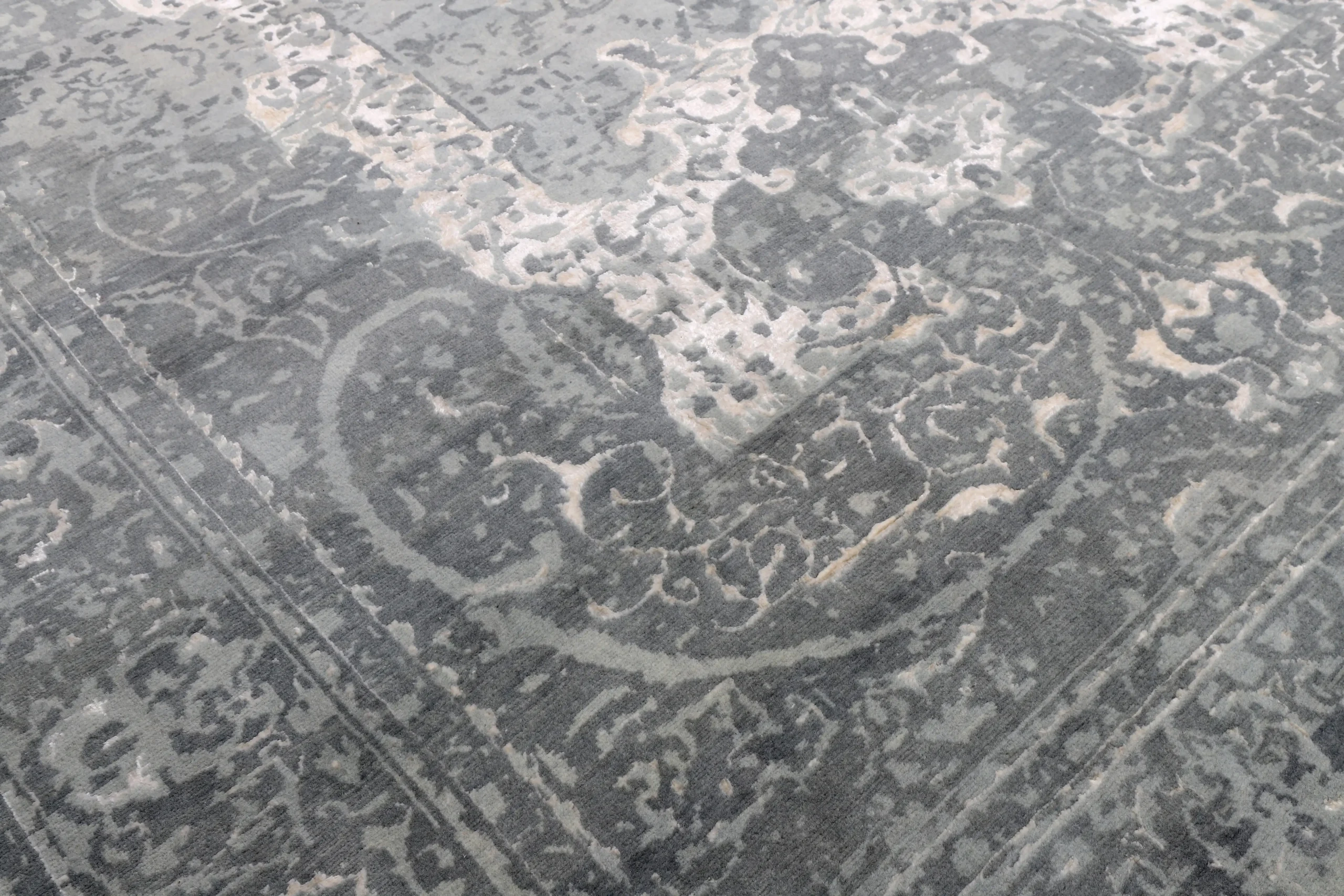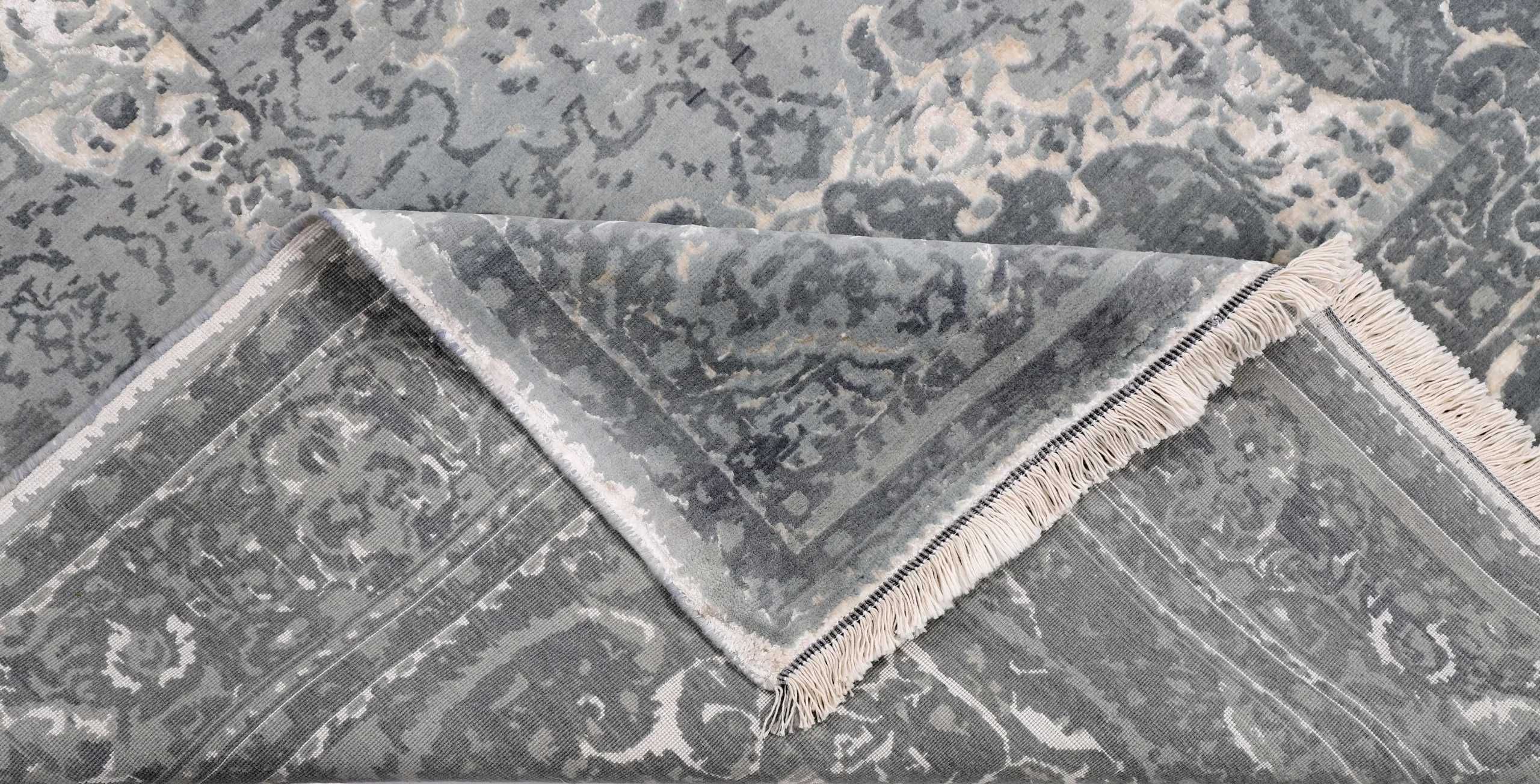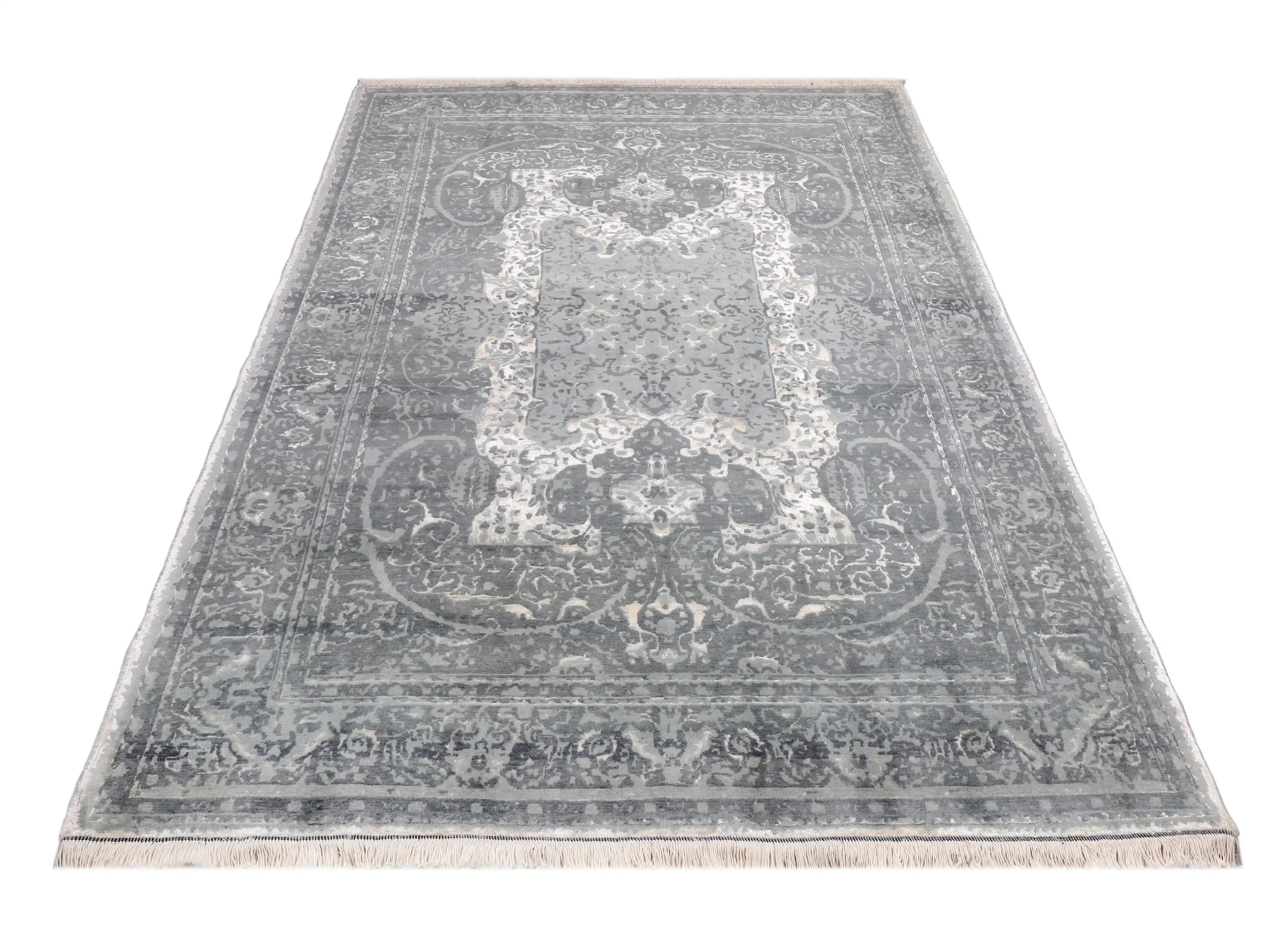 فرش دستباف کرک و ابریشم طرح سر درودی طوسی روشن با ظاهری لوکس و ماندگار برای دکوراسیون شما.