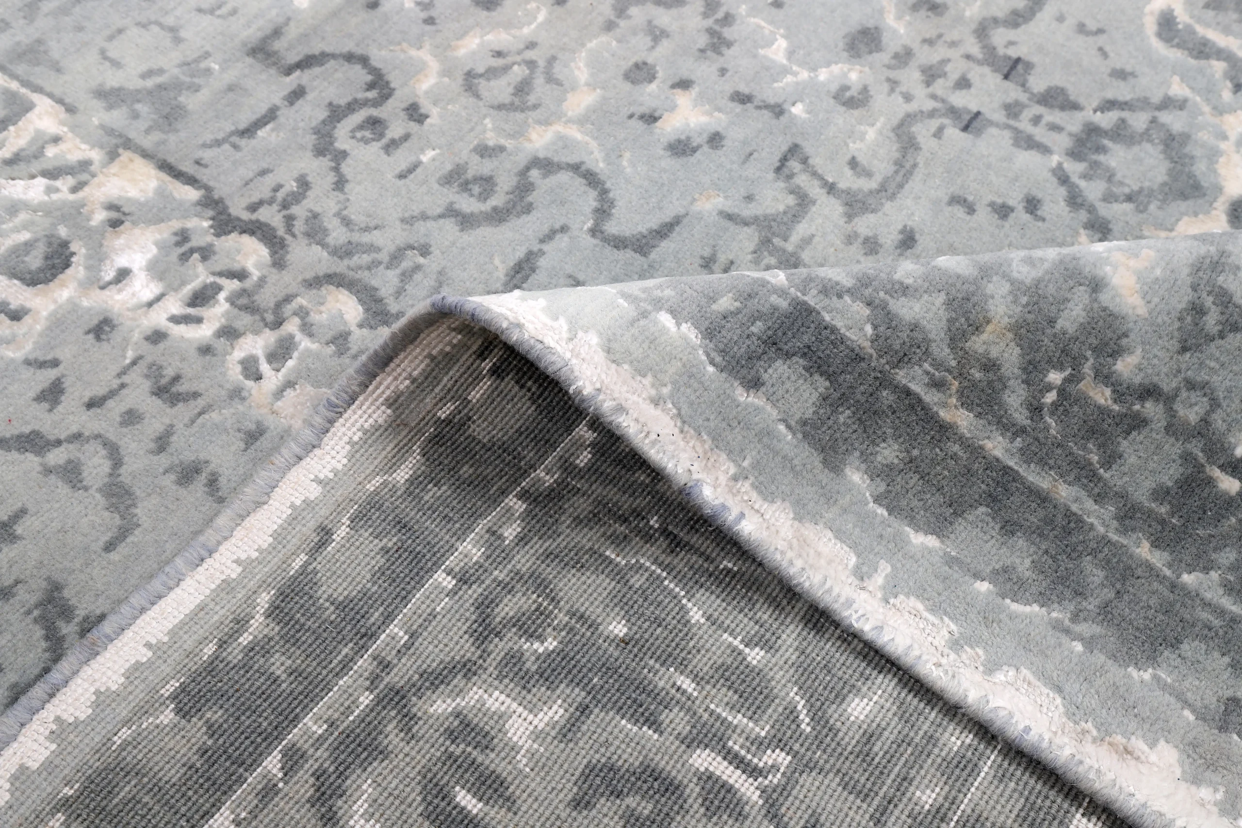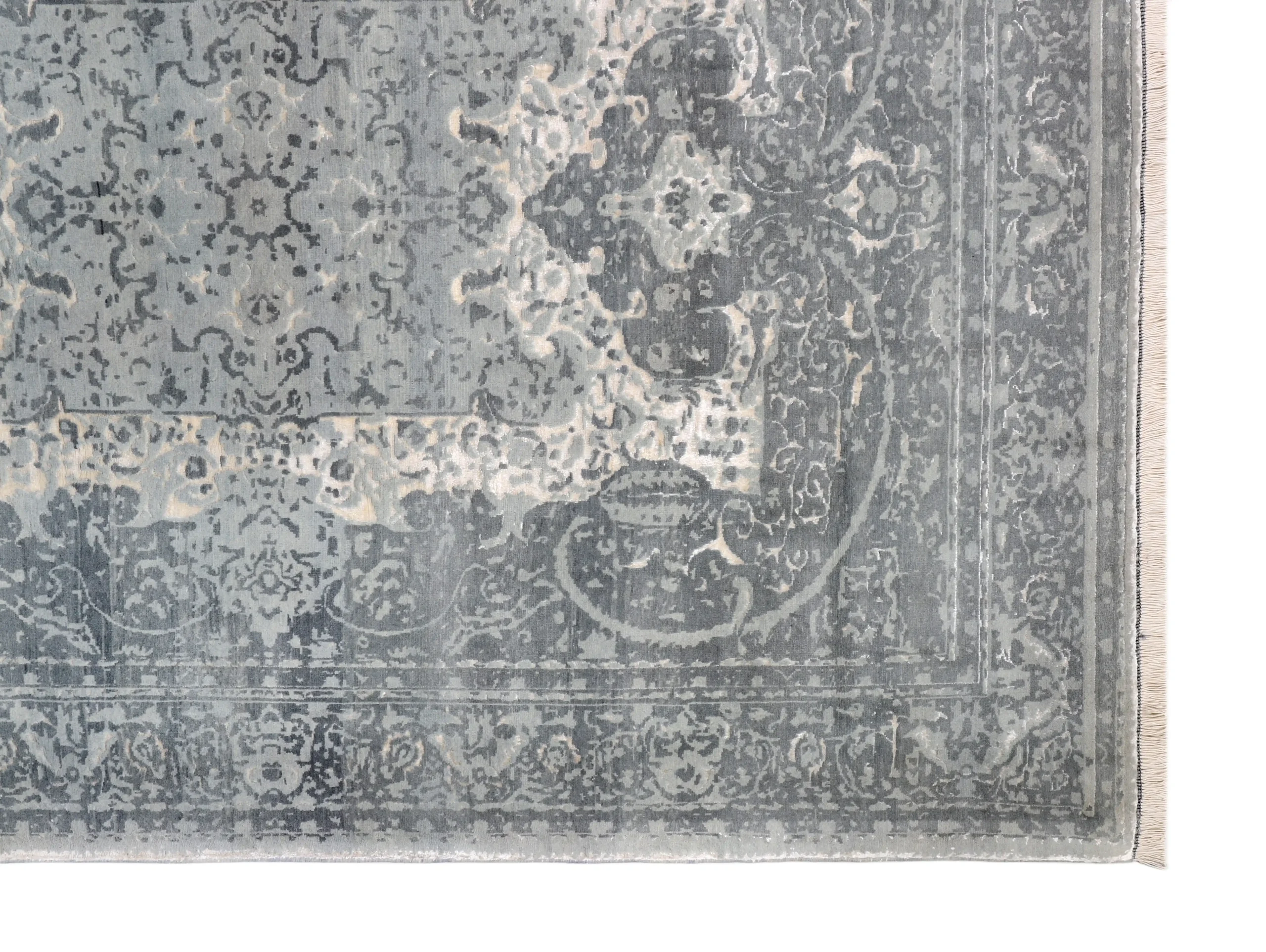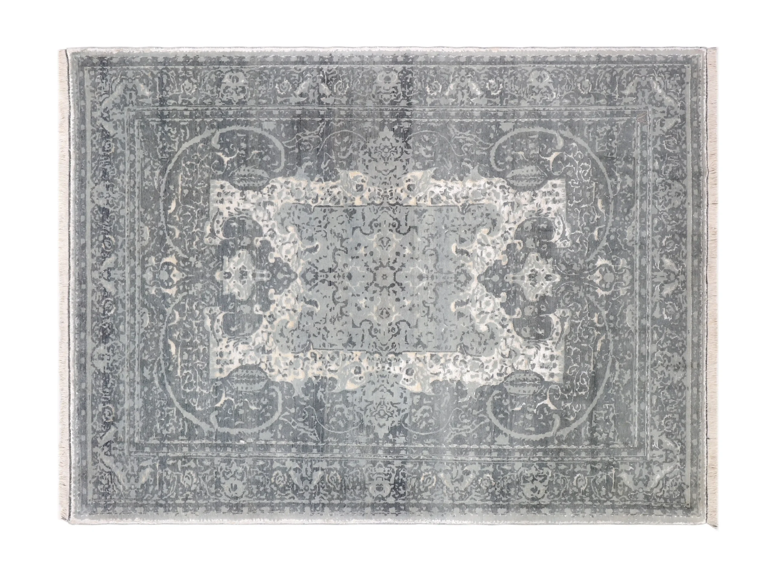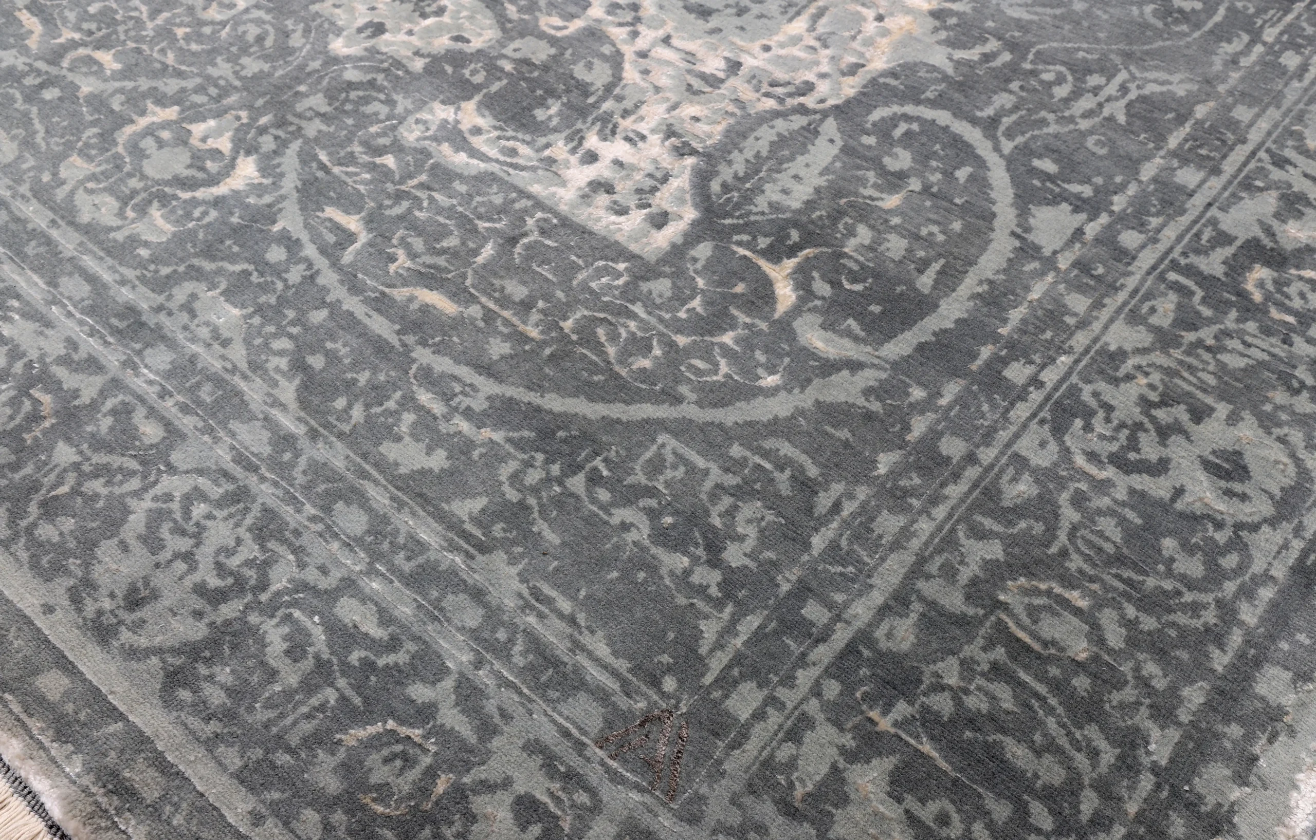 فرش دستباف کرک و ابریشم طرح سر درودی طوسی روشن با ظاهری لوکس و ماندگار برای دکوراسیون شما.