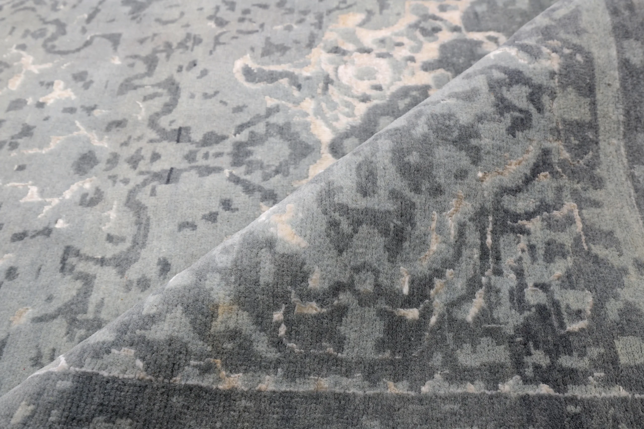 فرش دستباف کرک و ابریشم طرح سر درودی طوسی روشن