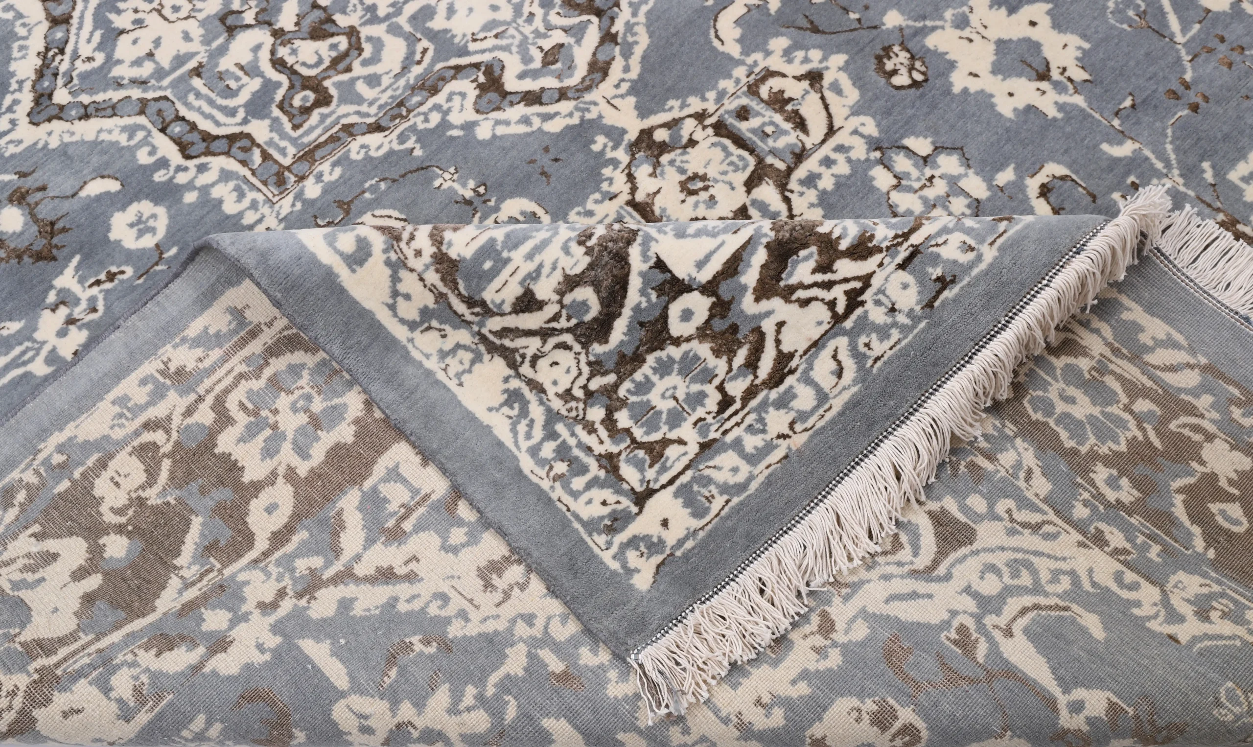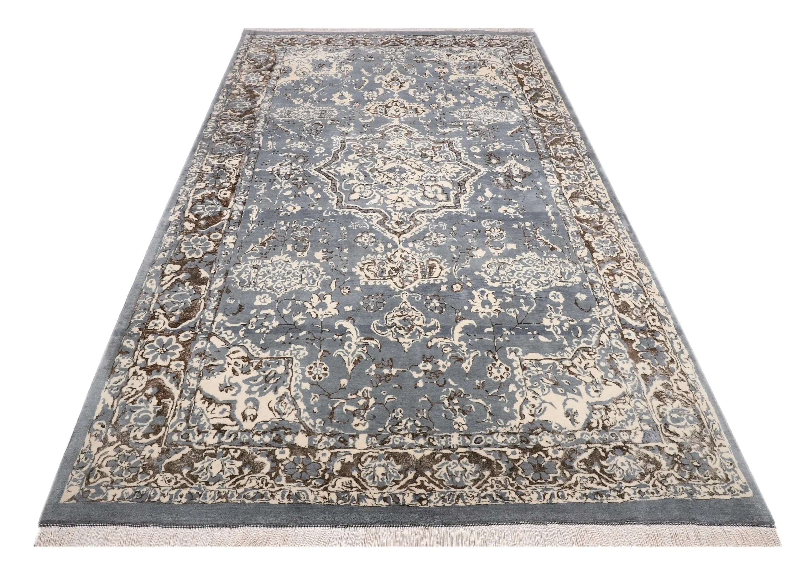 فرش دستباف کرک و ابریشم خاکستری قهوهای – گنجینهای نفیس برای دکوراسیون منزل با دوام و زیبایی بینظیر.