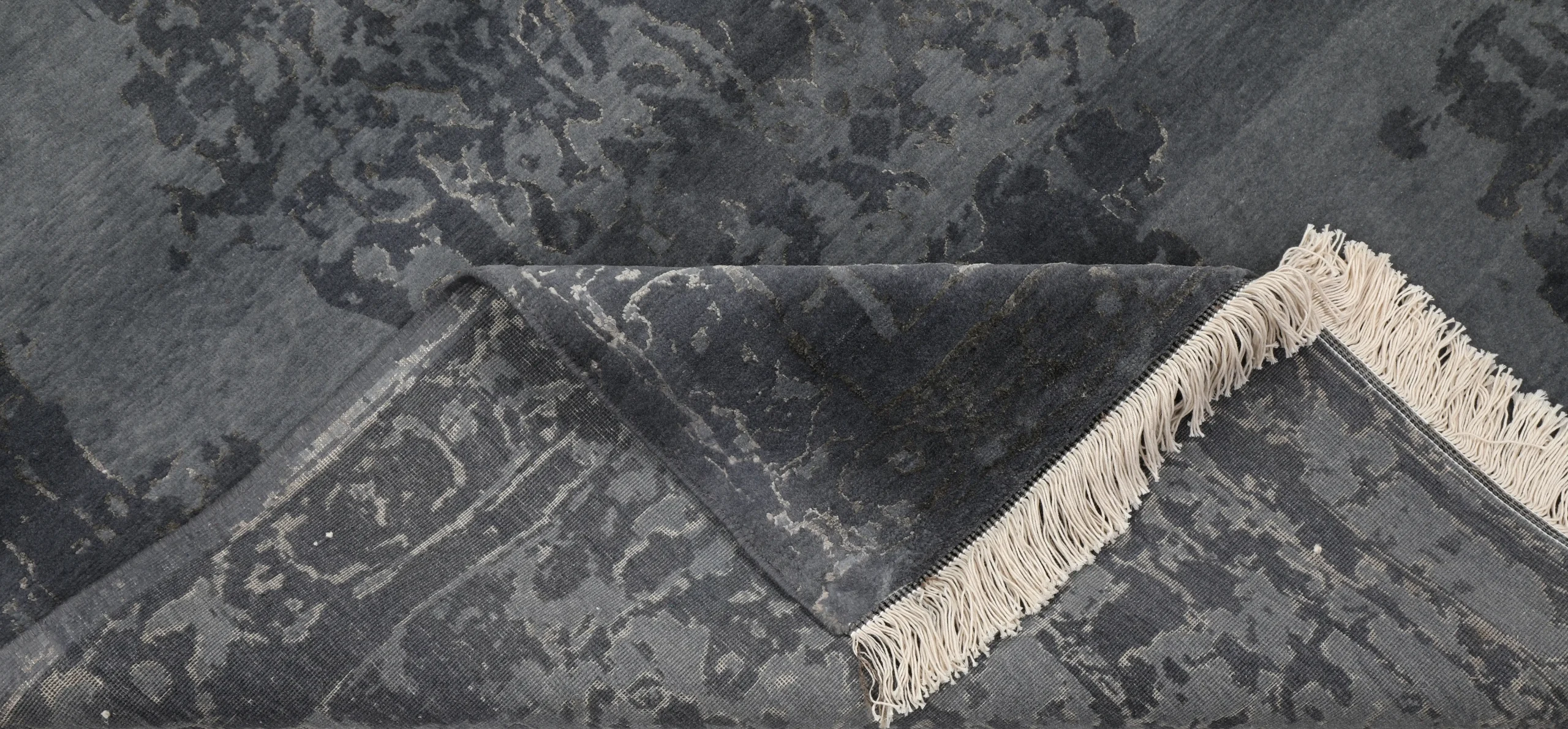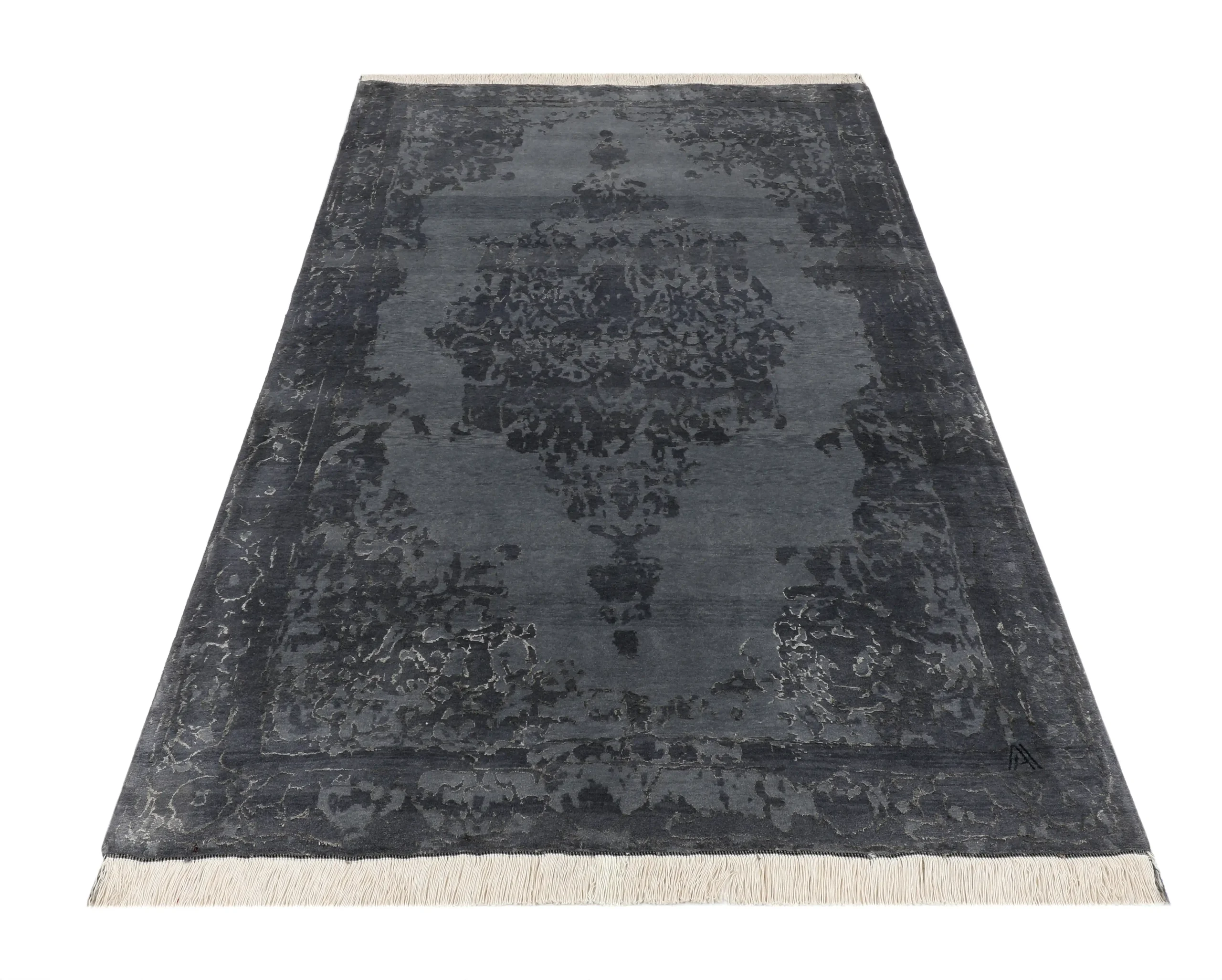 فرش دستباف کرک و ابریشم طرح صدف طوسی خاکستری، طراحی هنری، کیفیت ممتاز و هماهنگی بالا با دکوراسیونهای مدرن و کلاسیک.