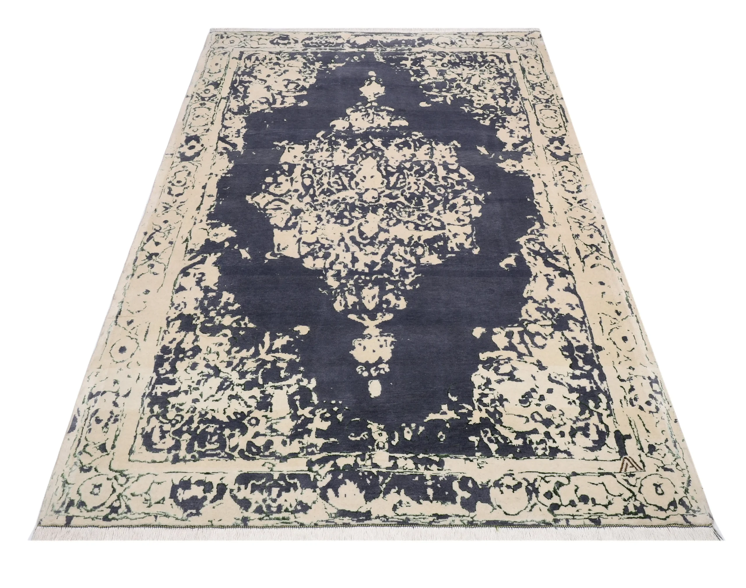 فرش دستباف کرک و ابریشم با زمینه طوسی آبی دودی از هنر اصفهان، طراحی زیبا و کیفیت بالا؛ گزینهای لوکس برای دکوراسیونهای مدرن و کلاسیک.