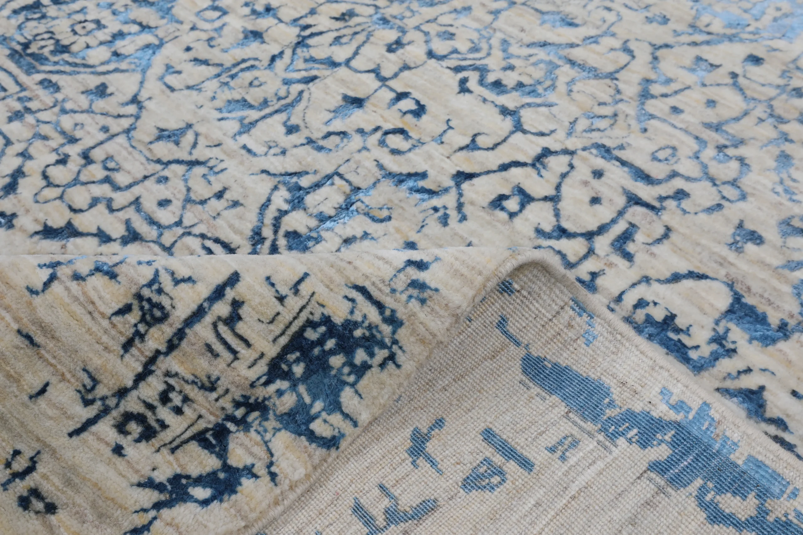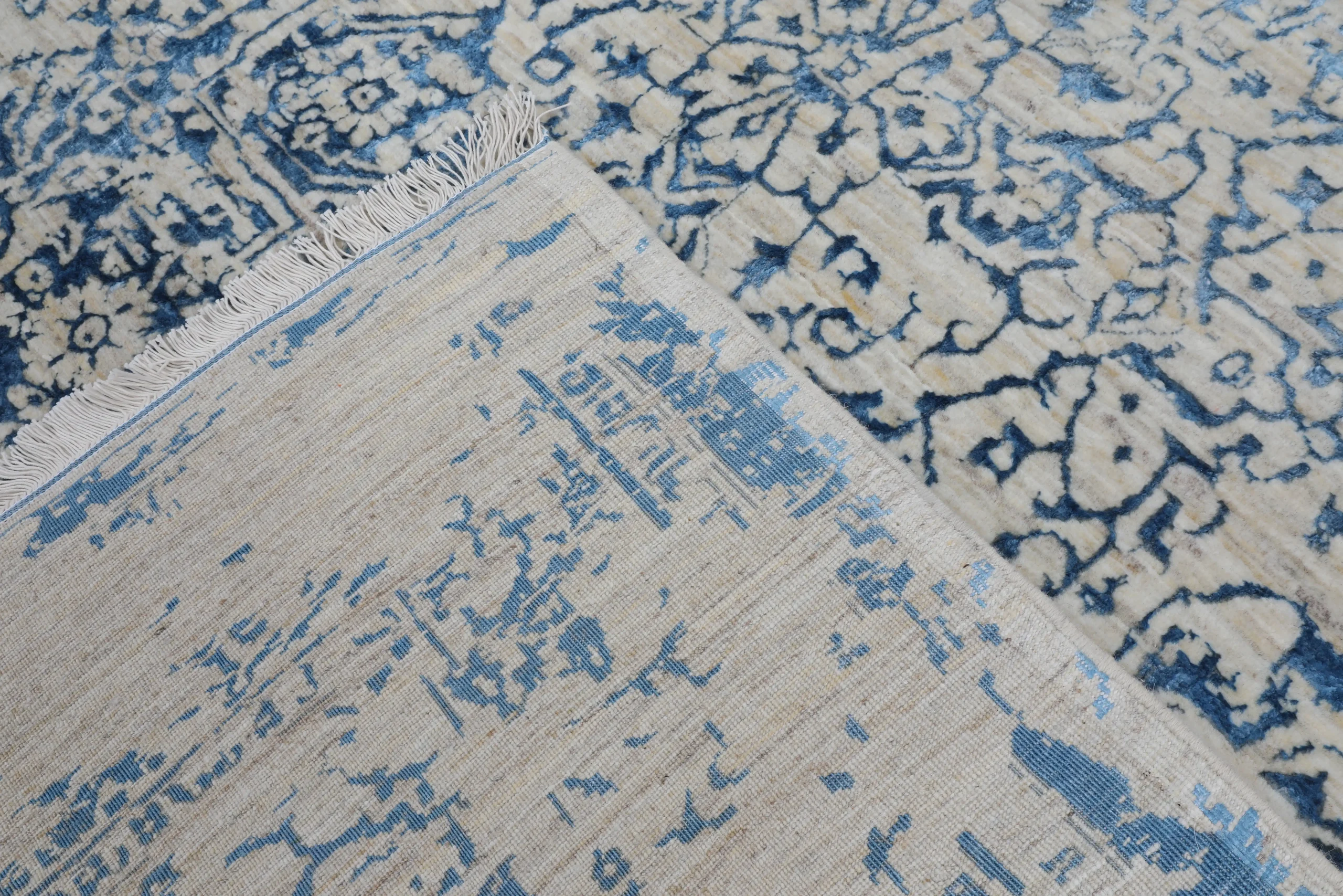 این فرش از کلکسیون مدرن بوده و با نقشه‌ی اطلس بافته شده است. بافت دستی، استفاده از کرک و ابریشم و رنگرزی گیاهی باعث شده تا هم زیبایی بصری و هم دوام طولانی فرش تضمین شود. نوع گره فارس (نامتقارن) به فرش ساختاری هنری و انعطاف‌پذیر می‌بخشد و جلوه‌ای خاص و فاخر ایجاد می‌کند.