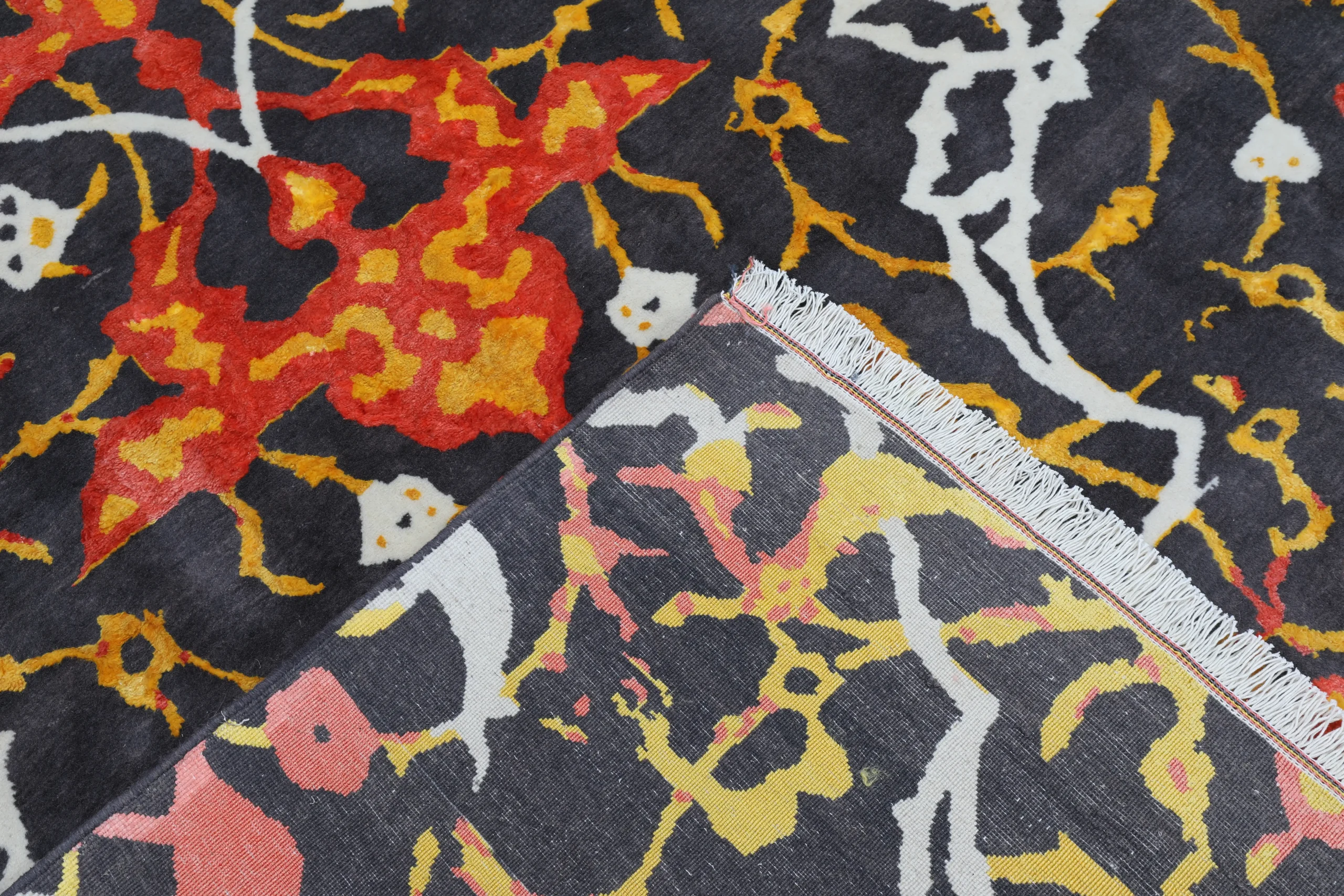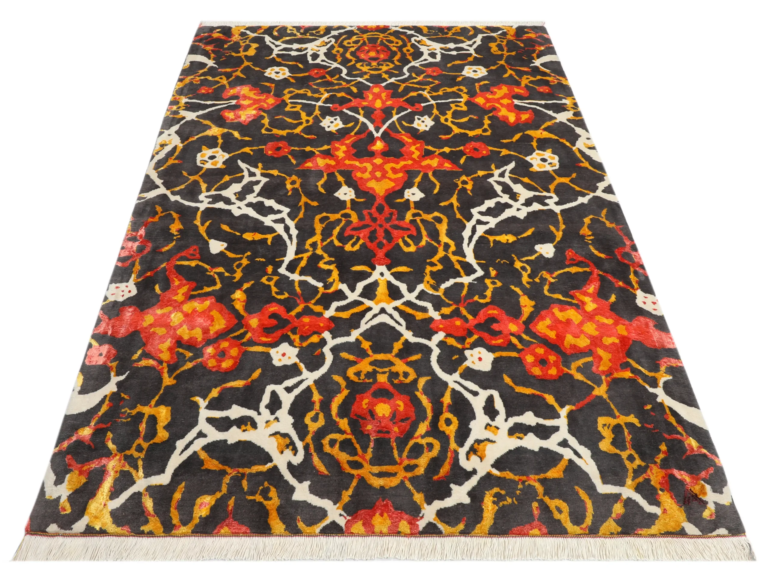 فرش دستباف کرک و ابریشم طرح کاشیکاری پردهای؛ ترکیبی از هنر سنتی ایرانی و طراحی مدرن با نقوش الهامگرفته از الگوهای کاشیکاری ایرانی.